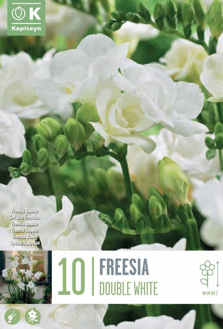 Freesia Double White is a highly fragrant, tender perennial bulb, often supplied by specialist growers such as Kapiteyn. It is prized for its lush, double white flowers carried on elegant, arching stems. Ideal for summer displays, Freesias perform beautifully in borders, containers, and as cut flowers, filling the garden with a sweet, uplifting scent.